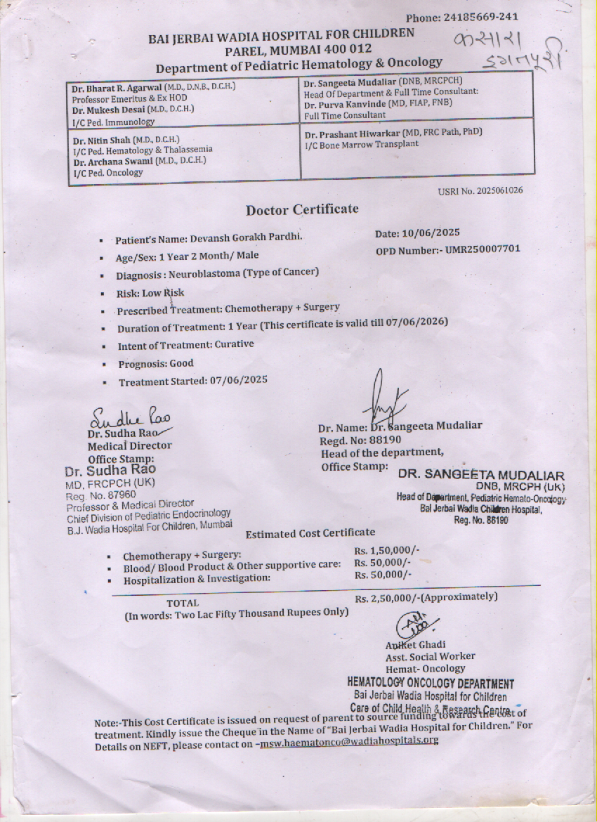 Family Details: – The Baby Father is poor & underprivileged & now he is jobless & facing a Financial crisis, hence they cannot afford the whopping amount for the treatment of the Baby. Devansh Gorakh Pardhi, living in Kasara, Baby has a rare type of cancer (Neuroblastoma).